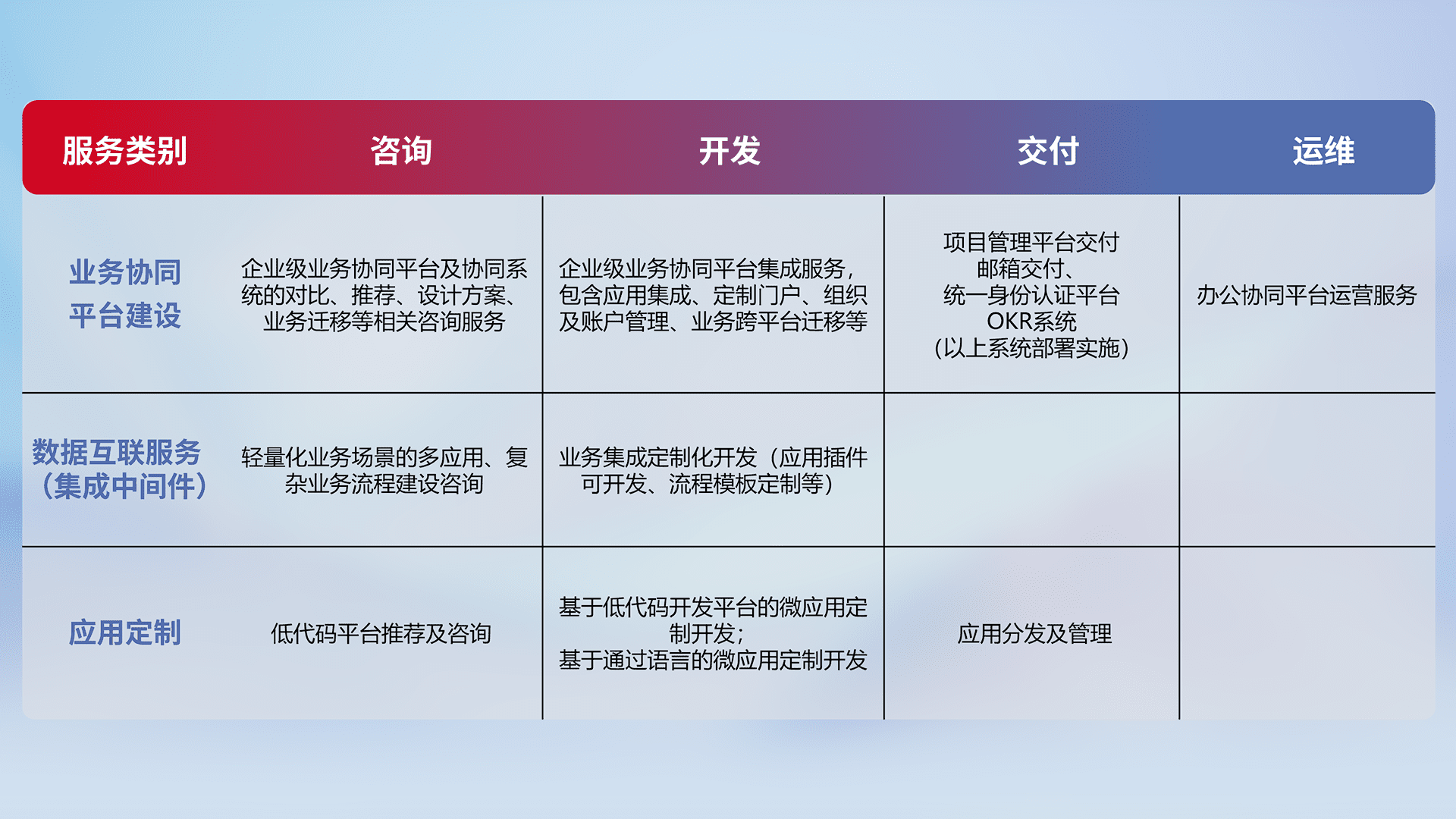 针对钉钉、、、企微、、IDaas等平台级产品提供产品的规划、、、方案、、、交付、、、定制化开发等服务,,,,实现如统一协同办公、、、智能客户服务、、、、混合会议管理、、、智能数据查询、、、等业务场景,,,实现数字化转型。。。
