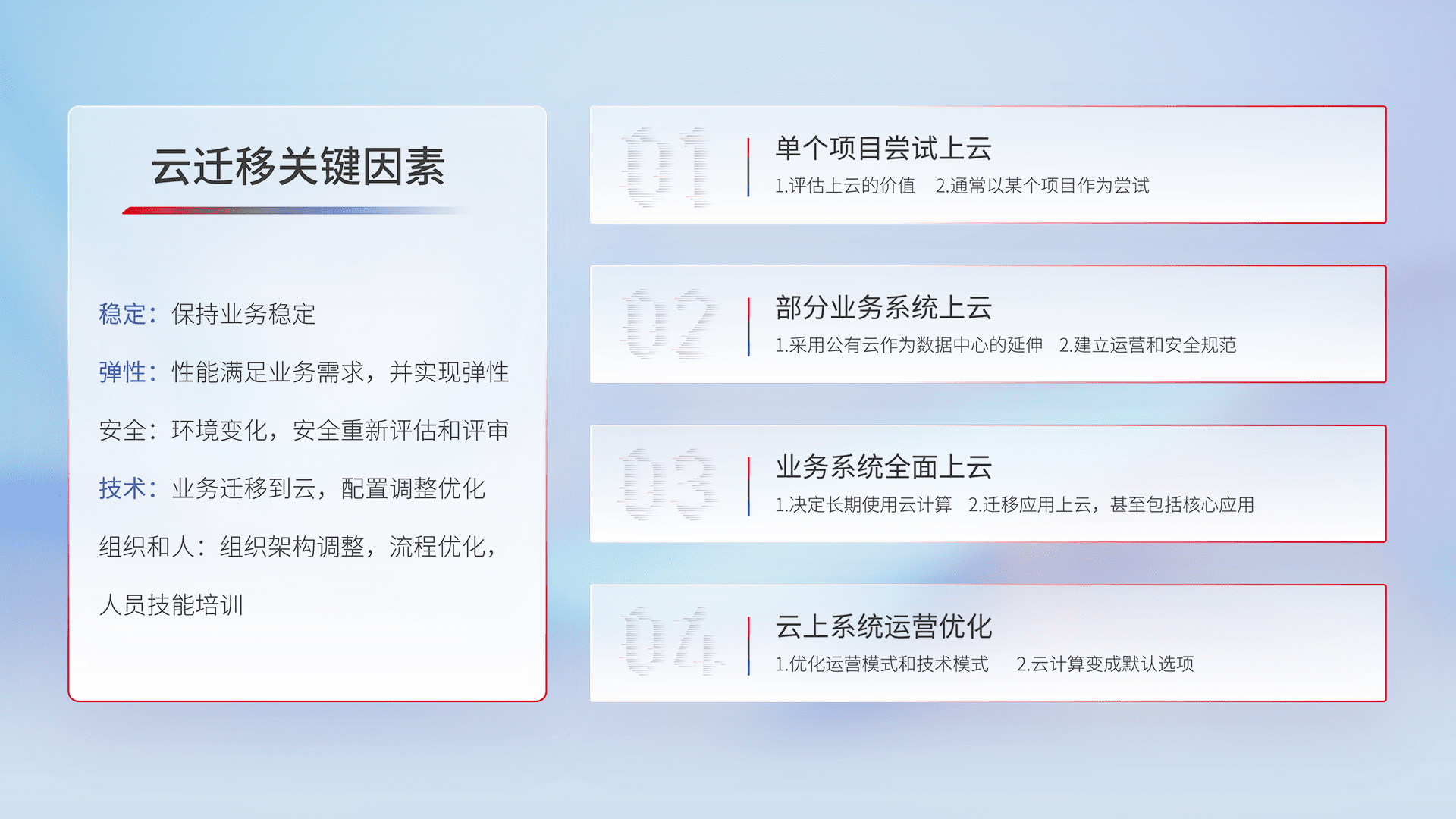 结合实际业务,,,从规划设计、、云平台选型、、、云原生改造、、数据迁移、、集成交付,,迁移全过程为客户识别最佳上云路径,,,做好风险识别管理,,,设计网络架构、、身份权限、、安全审计合规、、、、操作审计、、日志审计、、、监控告警策略、、、、多站点容灾设计等,,,对云上基础设施进行整体规划,,,提升IT治理水平,,,以满足弹性、、、高可用、、高性能的需求。。。
