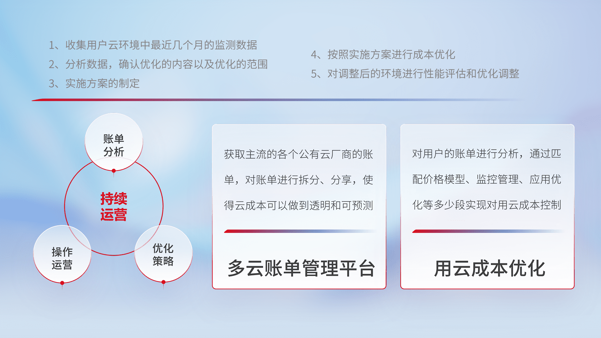 通过多云纳管,,,,以统一的资源数据模型把客户的云资源进行抽象和封装,,,,进而实现对多云资源的统一操作,,保障云资源管理的可靠性、、、稳定性与可用性。。。。量身定制化运维内容,,配置、、、开发运维、、、补丁管理、、、备份、、、监控、、、认证和访问管理、、审计和日常巡检等,,保障在用云过程中的可靠度,,稳定度以及高可用率。。。。